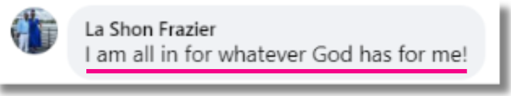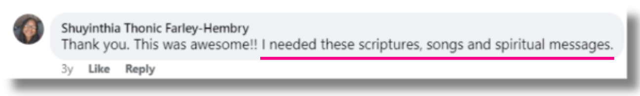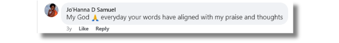 “August was an extremely powerful month for me. It’s an investment that I decided to make in myself. When I look back I can only see me and God during this Bible Study where I was covered with His love every day through daily prayer, praise and the messages He delivered to me everyday through Regina. I was filled with the spirit everyday and was able to experience His pure love and I could feel myself in His arms like a child after the Bible Study. I highly recommend this Bible Study to all the women and its just the answer for all your questions and you can experience His streams of love on you. Thank you Regina and you are truly a blessing to bring my God to my door step.”